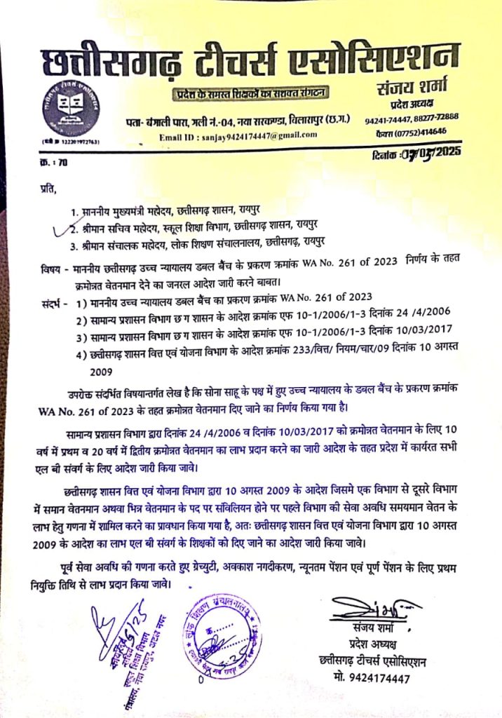 The memorandum referenced the Hon’ble Chhattisgarh High Court Division Bench’s decision (Case No. WA No. 261 of 2023), the General Administration Department’s orders dated 24/04/2006 and 10/03/2017, and the Finance & Planning Department’s order dated 10 August 2009, requesting that the decision to grant promotional pay scales, as determined in the Sona Sahu case, be implemented across the board.The General Administration Department’s orders stipulate promotional pay scales after 10 and 20 years of service. The association demanded that these orders be implemented for all LB cadre teachers. Additionally, the Finance & Planning Department’s 2009 order, which allows counting previous departmental service toward pay scale benefits when transferring between departments, should also be applied through a general order to all LB cadre teachers.The memorandum further requested that previous service periods be counted for gratuity, leave encashment, minimum pension, and full pension benefits from the date of initial appointment.Memorandum on Amendment to Rationalization RulesAccording to School Education Department Orders dated 02/08/2024 and 28/04/2025, the ongoing rationalization process is seen as adverse to the quality of education, student interests, teachers, and parents. The following key suggestions and demands were submitted:1. Promotions should first be made for principals, lecturers, teachers, and headmasters (primary/pre-secondary).2. As per the 2008 setup, minimum student numbers required one headmaster and four teachers. Reducing these positions will automatically render teachers surplus, which is impractical and violates the National Education Policy 2020.3. The primary school setup in 2008 approved one headmaster and two assistant teachers at minimum enrollment. Reducing a post is impractical and violates NEP 2020.4. Removing headmaster posts would reduce promotion opportunities for assistant teachers and teachers by up to 50%, which is unjust.5. Each primary and pre-secondary school should have independent status with a headmaster for effective administration and teaching.6. Schools running Balwadis (preschools) should have at least one additional assistant teacher.7. The reduction in positions following the 28/04/2025 order will harm newly qualified and unemployed teachers.8. There are serious concerns regarding deputed teachers and the implementation of rules in Swami Atmanand Schools.9. Rationalization will increase workloads in higher secondary schools, undermining NEP implementation.10. Merging lower schools into higher-level campuses will negatively affect independent administration and teaching.11. Reducing minimum teacher numbers in primary and middle schools will lower educational standards.12. Approval of departmental setups in Pota Cabins across Bastar division is necessary.13. Guest teachers should be considered surplus first in any adjustments.14. The student number benchmarks for rural vs. urban school mergers are inconsistent.15. The department should consult employee organizations before issuing unilateral directives on education matters.Delegation MembersThe delegation included State President Sanjay Sharma, State Coordinator Sudhir Pradhan, State Secretary Manoj Sanadhya, State Treasurer Shailendra Parik, Mahasamund District President Narayan Choudhary, Dhamtari District President Dr. Bhushan Chandrakar, Naveen Choudhary, Gewaram Netam, Nand Kumar Sahu, Khilawan Verma, Pawan Sahu, Dinesh Sahu, Kanwal Ram Sahu, Khileshwar Kashyap, Lomash Sahu, among others.From Raigarh district, key office bearers included State General Secretary Gurudev Rathore, State Joint Secretary Mrs. Sapna Dubey, State Organization Joint Secretary Binesh Bhagat, State Women Representative Mrs. Manju Purseth, District President Netaram Sahu, District Women Chief Mrs. Gayatri Thakur, District Coordinator Bholashankar Patel, Senior Vice President Gurunath Jangde, Vice Presidents Panchram Yadav, Lingraj Behera, District Secretary Nohar Singh Sidhhar, Treasurer Mrs. Rashmi Sahu, Mrs. Manju Awasthi, Vijay Patel, Bhupesh Panda, Sachchidanand Purseth, District General Secretary Santosh Kumar Patel, Block Presidents Guru Charan Bhagat (Tamnar), Lakshmi Prasad Dhurve (Raigarh), Sunil Patel (Gharghoda), Khageshwar Patel (Kharsia), Narendra Chauhan (Pusaur), Ramniwas Miri (Lailunga), Bhawan Sai Porte (Lailunga), Acting President Hetram Patel (Tamnar), District Organization Minister Sevkaram Mohle, Block Women Chief Mrs. Rajni Mahilange (Raigarh), Mrs. Prema Sidhhar, Mrs. Savita Singh, Mrs. Madhuri Patnaik, Mrs. Smita Mishra, Palu Ram Sidhhar, Pramod Kumar Nikunj, Parsuram Khadia, and others.The delegation requested the state government to review and promptly address the issues.