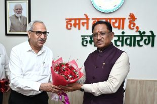 रायपुर 6 अगस्त 2025/ मुख्यमंत्री श्री विष्णु देव साय से आज राजधानी रायपुर स्थित मुख्यमंत्री निवास कार्यालय में भिलाई स्टील प्लांट के नवनियुक्त निदेशक श्री चित्त रंजन महापात्र ने सौजन्य मुलाकात की। इस अवसर पर श्री महापात्र ने मुख्यमंत्री श्री साय को पुष्पगुच्छ, शॉल और श्रीफल भेंट कर सम्मानित किया। मुख्यमंत्री ने श्री महापात्र को उनकी नवीन पदस्थापना पर हार्दिक …